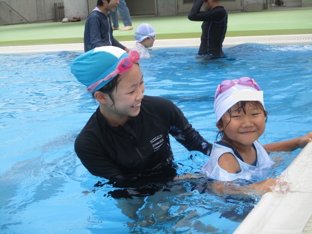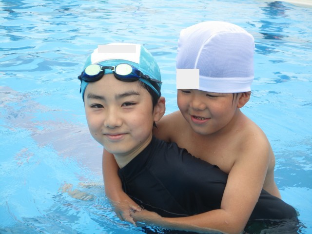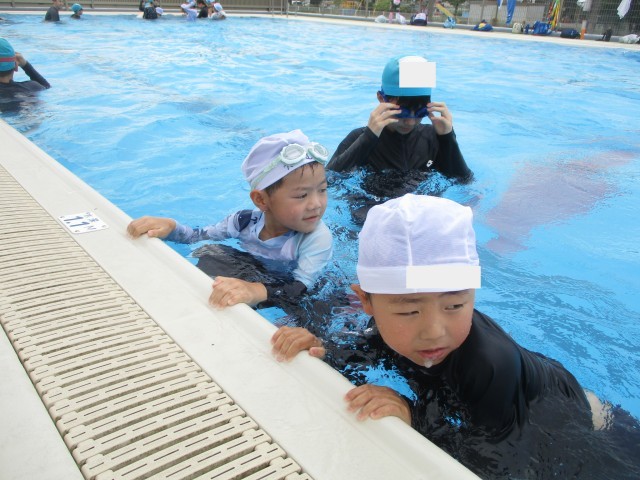 プール開きを行いました。初日は、6年生と一緒に入りました。シャワーの浴び方や、入水の仕方を教えてもらいました。初めてのプールは水の量が多くて、驚いた様子でしたが、6年生に支えられ楽しく活動することができました。