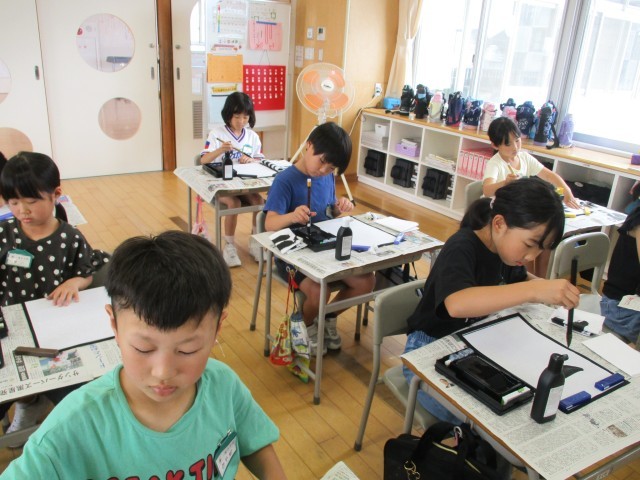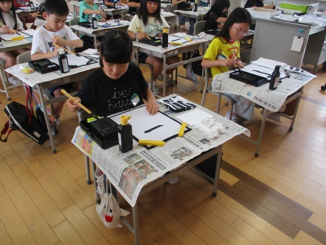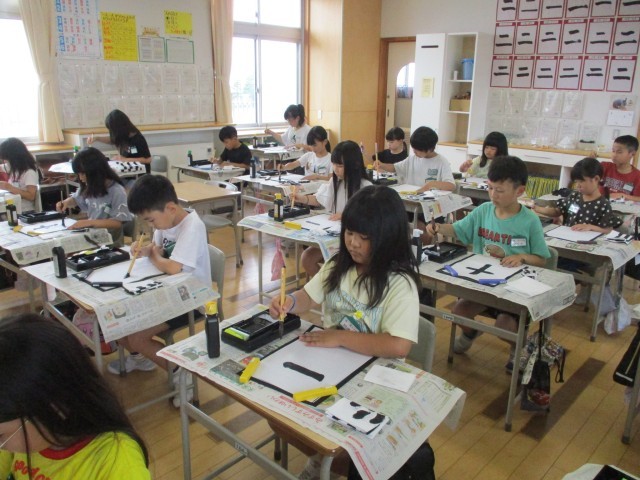 3年生は、「土」の学習をしました。今まで横画を練習していましたが、縦画に挑戦しました。最初は難しいと言っていた子供たちでしたが、筆先を丁寧に整えたり、押さえを意識したりして真剣に練習に取り組みました。