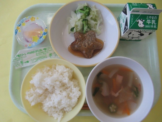 明日からは「7月」。今日のメニューは、「星形ハンバーグ」「天の川スープ」「七夕ゼリー」などと「七夕献立」です。三成っ子は、7月7日(月)に、どんな願いごとをするのでしょうか? また、この機会に、織り姫と彦星の「七夕伝説」や、その他の「中国の伝説」なども読んでみると楽しいですね。