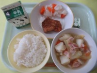 ・ごはん ・牛乳 ・豚肉の香り揚げ ・ピクルス ・野菜のスープ煮 ・ポケットチー...