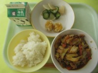 ・ごはん ・牛乳 ・にんじんシューマイ ・甘酢和え ・回鍋肉※11時45分、検食...