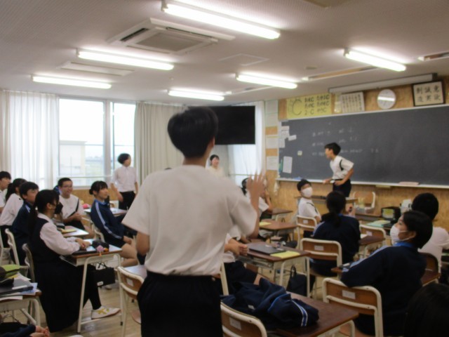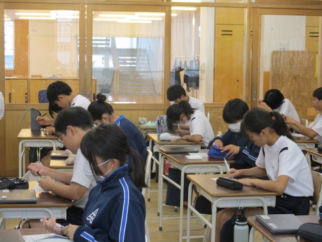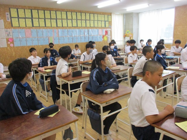 今日の学活は、明後日に迫った金沢校外学習のしおりの読み合わせをしました。B組では、どれだけ読み込んであるか、担任の先生からのクイズ形式での質問に競い合って答えていました。明後日が楽しみです。他の学級では、しおりの読み合わせの他に、掃除の場所決めやアンケート調査も行ったようです。