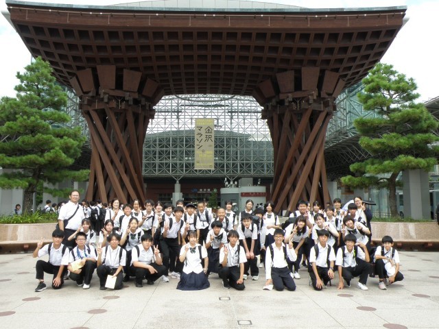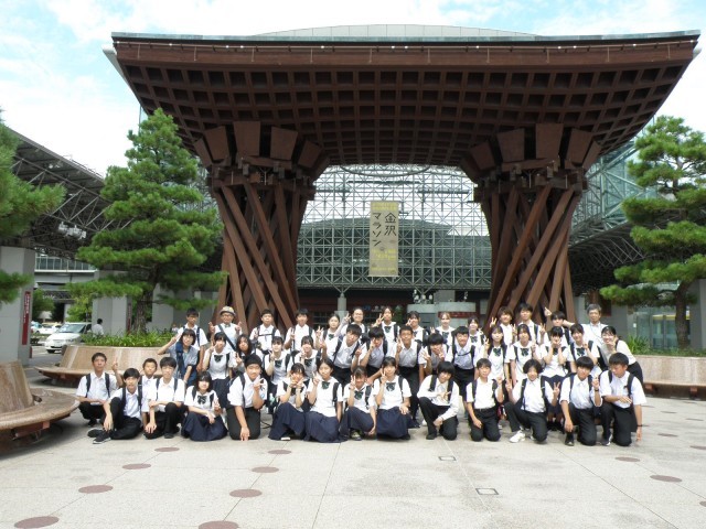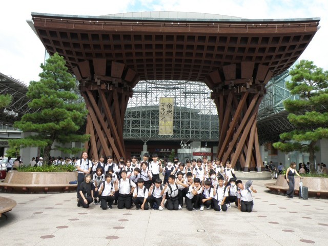 校外学習開始前に、金沢駅の鼓門の前で集合写真を撮りました。