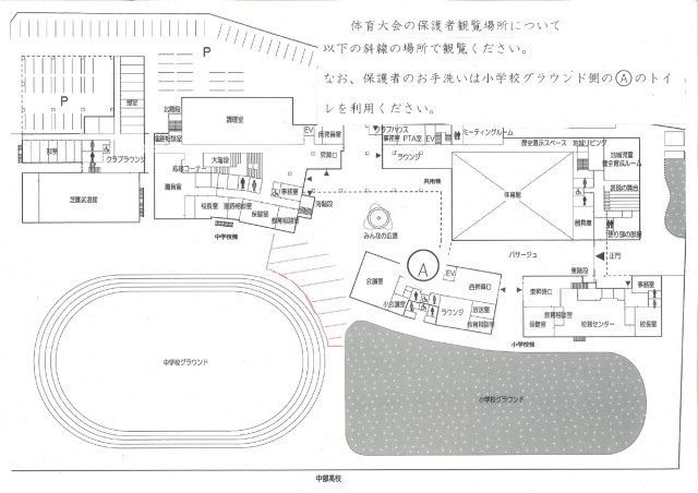 体育大会の保護者観覧場所をお知らせします。なお、保護者の方は、生徒がグラウンドに移動したのち(8時30分ごろ)よりご案内しますので、ご了承ください。なお、保護者の方々のお手洗いは小学校側のトイレになります。