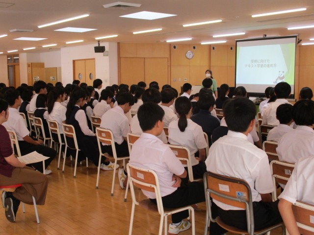 今日から始まるテキスト学習について、詳しい説明がありました。テキストは本日配布され、家に持ち帰ります。計画に従って、毎日1教科ずつ、あるいは1週間分まとめてといった具合に、自分の生活スタイルに合わせて取り組むことになります。各ご家庭での声掛け及び確認のサインへのご協力をよろしくお願いいたします。