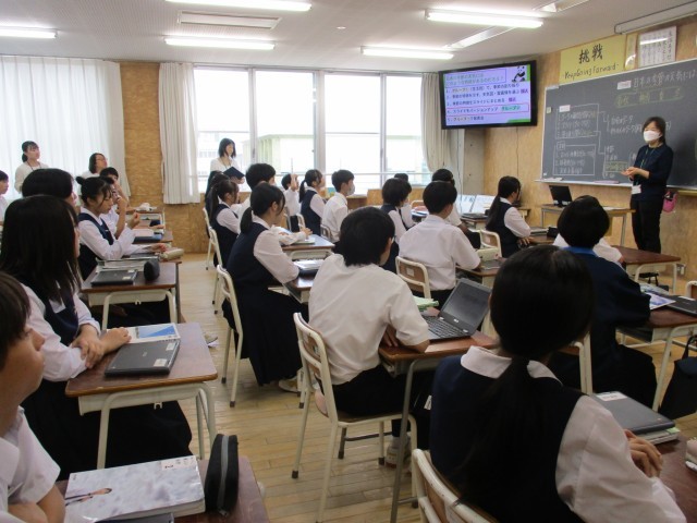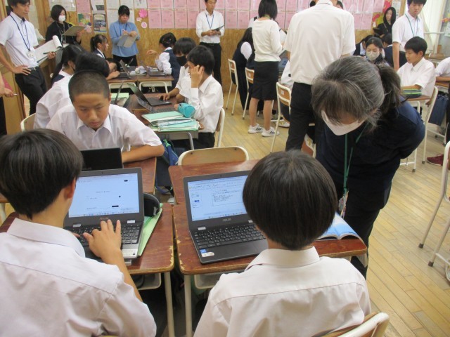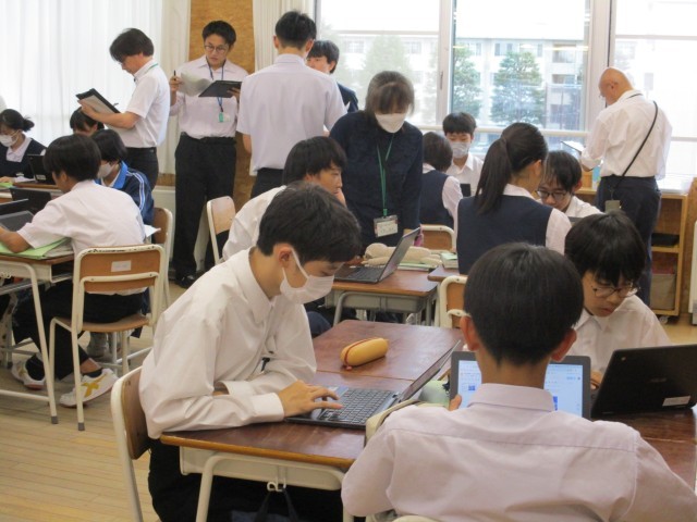 2-Bでは、日本の季節の天気にはどのような特徴があるのか、雲画像や天気図を用いて考えました。各班から、同じ季節を担当する人が集まってグループを作り、情報交換しながら進めました。