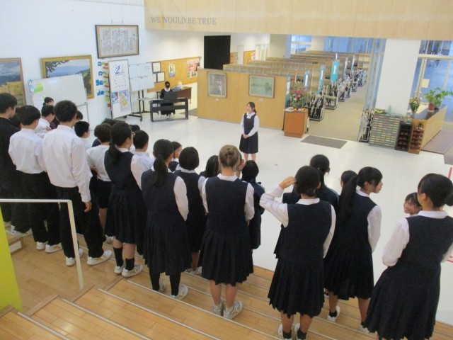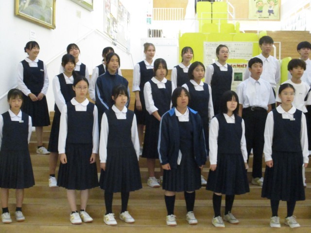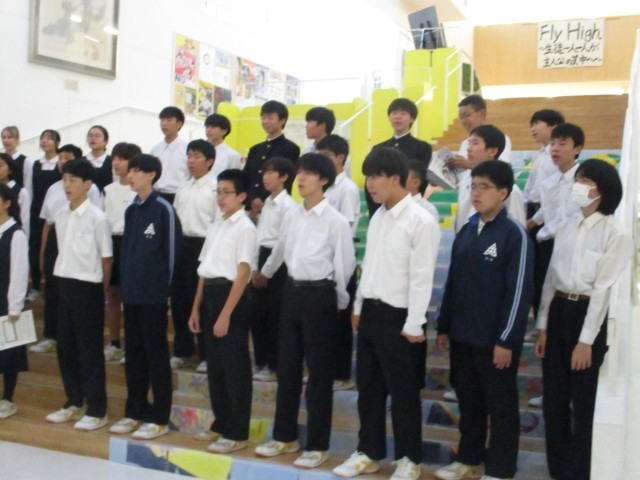 2学年 合唱練習の様子2-C 公開日 2025/10/20 更新日 2025/10/20 芝園の一日 今日は大階段を使っての練習だったので、吹き抜けの場所で、のびやかに歌うことができました。歌詞や強弱を確認しながら、来週のリハーサル、そして本番に向けて頑張っていました。