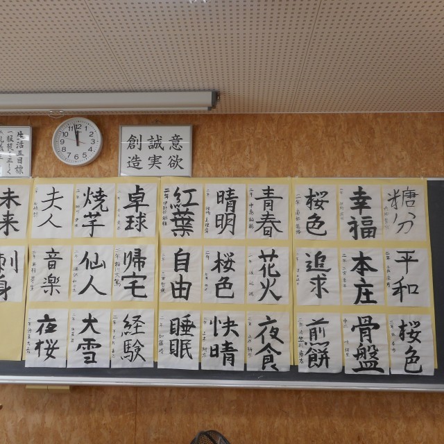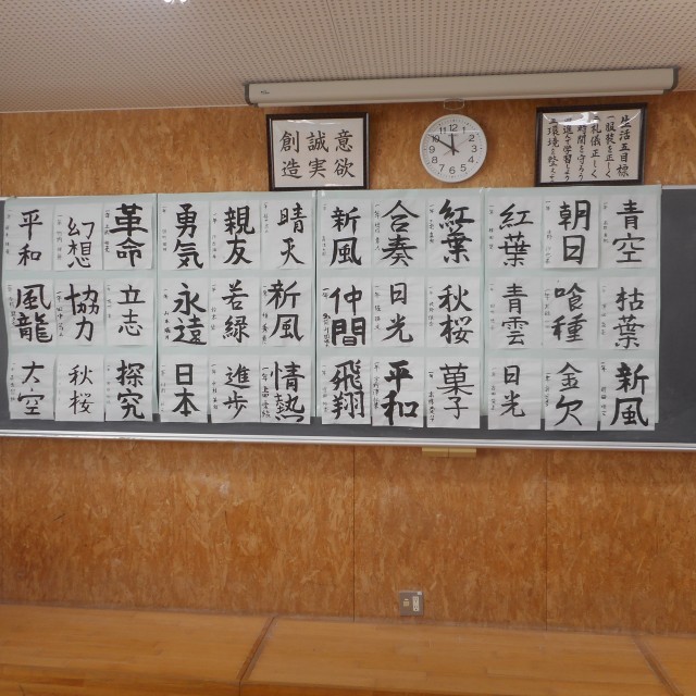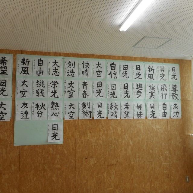 今日も学校を巡っていますと、習字の作品が展示されていました。