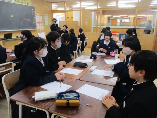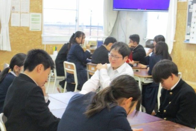一人ひとりに将来のことを考えてもらうとともに、進路や職業、生き方について自分なりの目標をもつきっかけとして、生徒会執行部による生徒集会が行われました。2学年代表の先生が登場すると、自然に視線が上がり、モニター越しに語られる言葉に聞き入っていました。その後、グループを作って、それぞれの夢を語り合う時間では、まだ夢はないと語る人も、級友の夢や目標を知って、「お~」「へぇ~」という声が上がっていました。互いに大いに刺激になったようです。