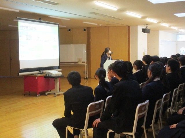 学年主任から日程の説明を聞き、みんな嬉しそうな表情でした。また、修学旅行が、生徒自身による主体的な活動になるように、修学旅行に向けての準備では、修学旅行実行委員を募集し、スローガンやルールを決める準備をしたり、クラス別や班別コースを決めるための資料作りをしたりする予定です。