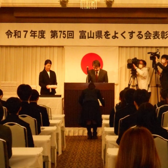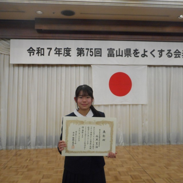 富山県をよくする会表彰式 公開日 2026/01/26 更新日 2026/01/26 校長室から 1月23日(金)に「富山県をよくする会」の表彰式があり、個人の部で3A石黒さんが受賞されました!すばらしい!