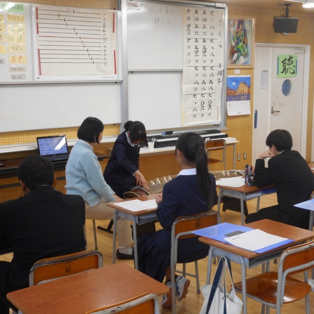 本日、1Cにおいて、「日本の伝統音楽に親しもう ~琴を弾いてみよう~」を題材とした授業が展開されていました。