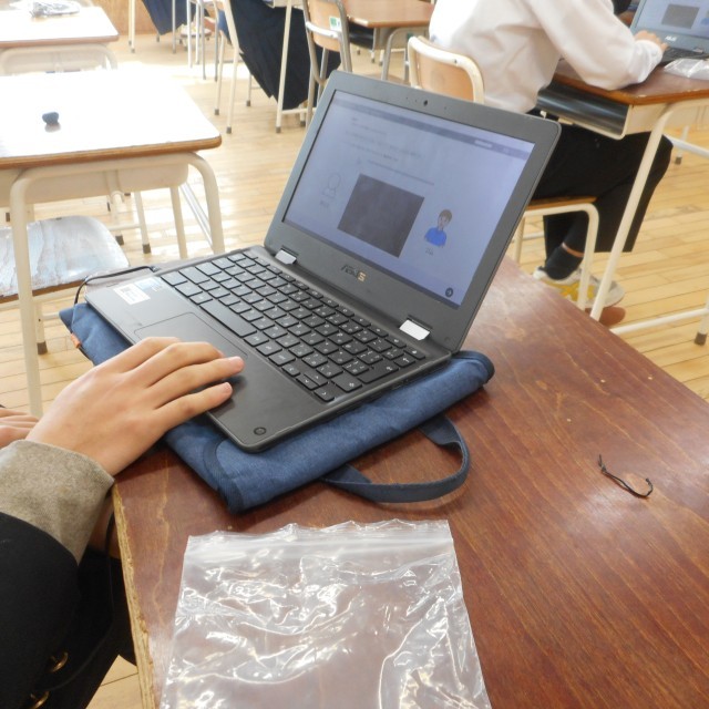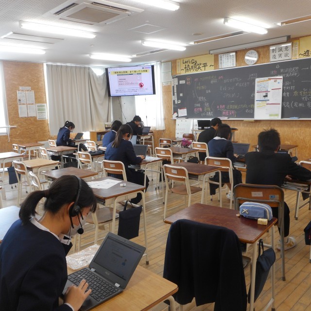 2年生は、3年生に進級してから実施される全国学力学習状況調査の英語でのスピーキング調査の検証を、実際にヘッドレストを付けながら試行として進め、確実に繋がっているか等確かめていました。