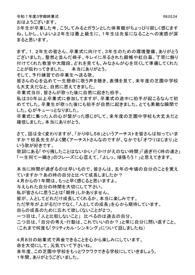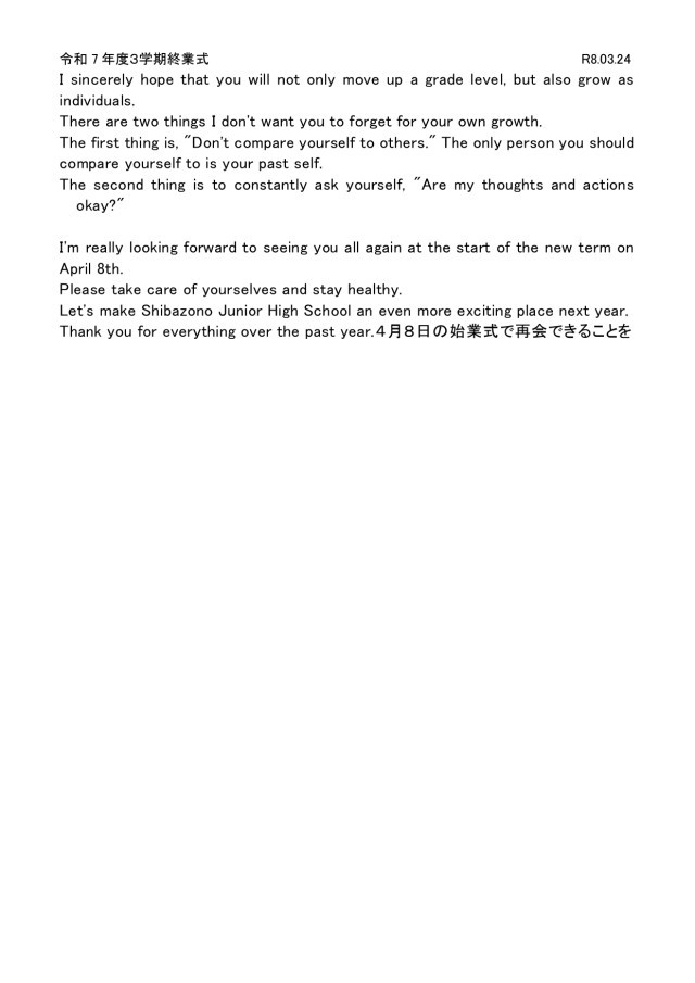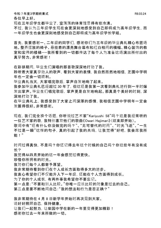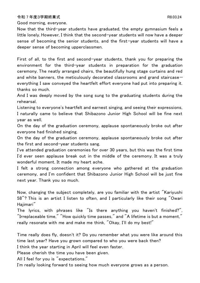 修了式の式辞を、日本語、英語、中国語で掲載しますので、是非ともご一読ください。