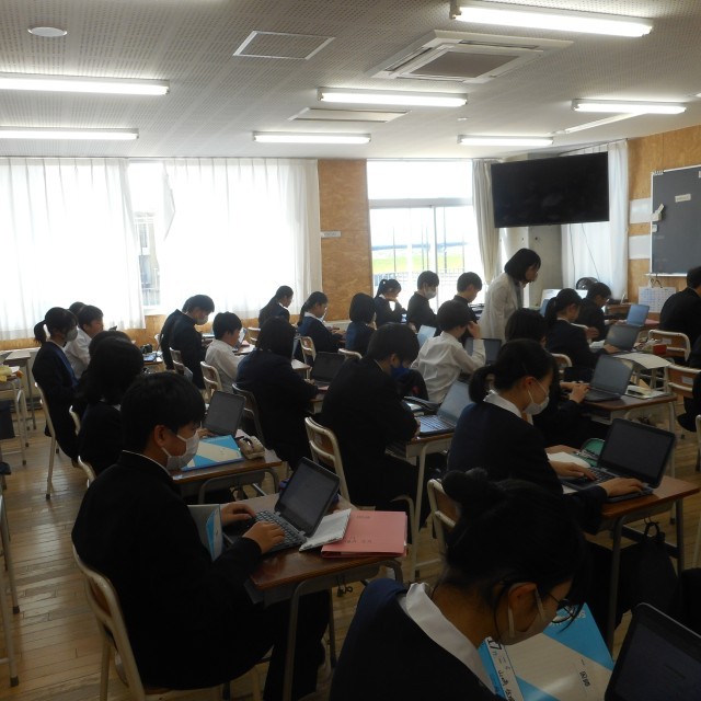 【写真左】 3年国語科 端末を使って自分の考えをアウトプットしていました。