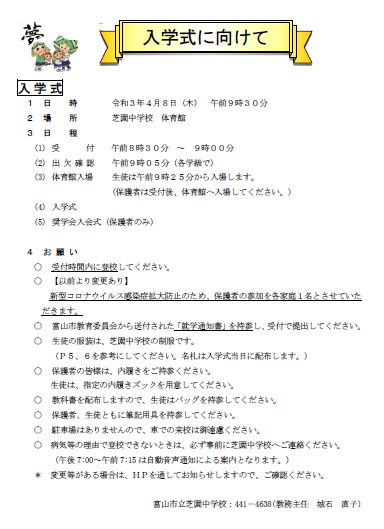 令和3年度 芝園中学校入学式について(再掲) 公開日 2021/04/07 更新日 2021/04/07 芝園の一日 4月7日(水) 明日は、令和3年度の入学式です。 日時や日程等の概要は下記の通りです。 HPの配付文書欄にも掲載しておりますので、ご確認ください。