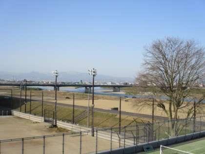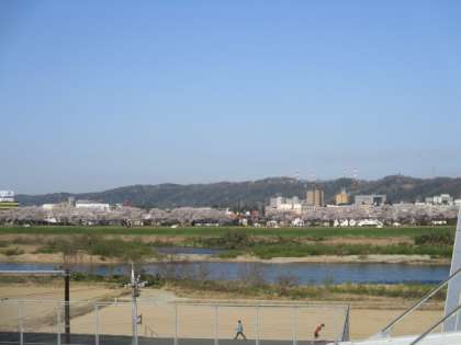 4月1日(木) 「神通の清けき流れ」 校舎から神通川を望みました。 左岸の桜並木が満開です。