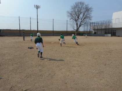 野球部は、ベースカバーの練習をしました。上級生が下級生に声をかけて連携の仕方を指示しています。