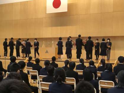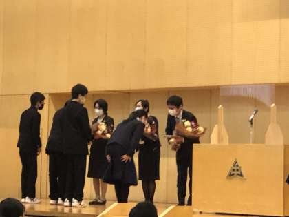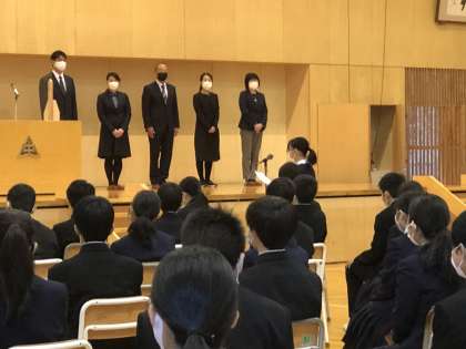 4月6日(火) 退任・離任式の様子です。 生徒代表のお別れ挨拶の後、感謝のお手紙と花束をお渡ししました。
