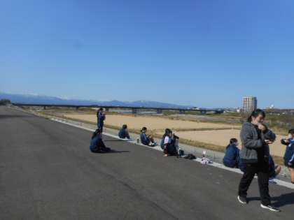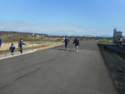 女子バドミントン部は、青空のもと河川敷でランニングから始めました。