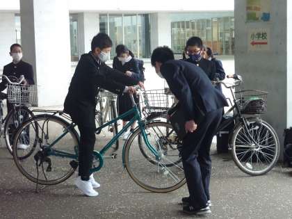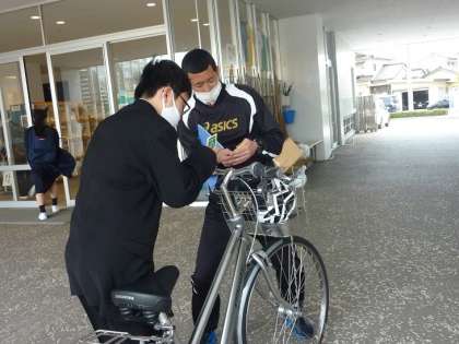 4月13日(火) 放課後の活動です。 自転車通学の生徒が自転車の点検を受けています。
