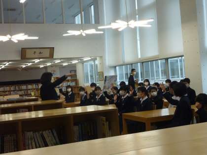 図書室では、司書の先生から図書室利用の仕方の説明を聞きました。