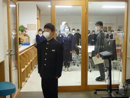担任の先生から、中学校の校舎内を案内してもらっています。