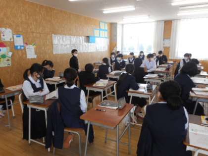 家庭科は、自分の考えを発表しています。発表する人に体を向けて聞く姿勢が素晴らしいです。