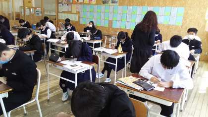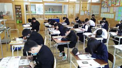 本日の授業(2年生:その1) 公開日 2021/04/22 更新日 2021/04/22 芝園の一日 4月22日(木) 2年生の美術の様子です。 明朝体とゴシック体の特徴を捉えて、レタリングに取り組みました。