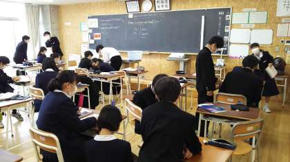 課題について、近くの席の生徒と練習しています。