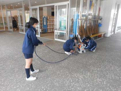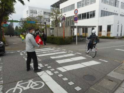 けやき通り前の交差点を爽やかな挨拶で登校する生徒や、生徒玄関前のプランターに水やりの準備をする生徒がいます。