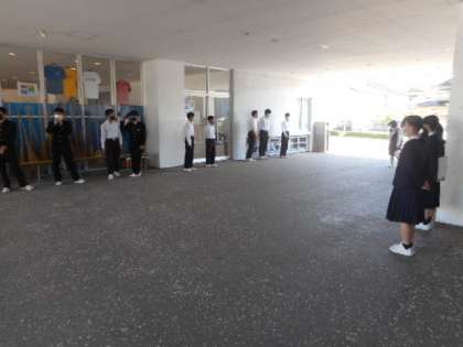 今朝は、小学生と一緒に芝園小中学校の正門でもあいさつ運動を行いました。