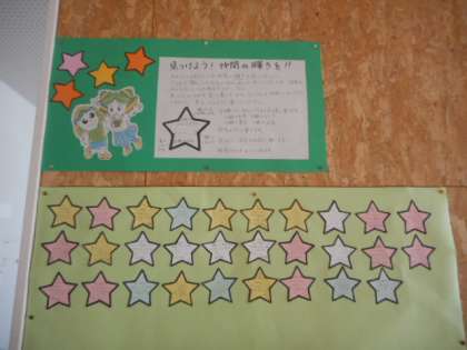仲間のよいところを見つけたら、星形の用紙に書いて掲示していきます。「朝さわやかに挨拶をしている姿」や「体育大会の練習のときに、一生懸命に取り組んでいる様子」などが書かれていました。