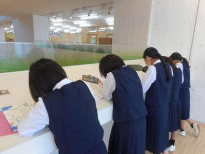 1年生は、教室以外にもカウンターや多目的スペースを活用して学習していました。