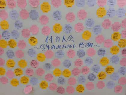 体育大会感謝のメッセージ(3年生) 公開日 2021/05/25 更新日 2021/05/25 芝園の一日 5月25日(火) 3年生の学年フロアに「体育大会〜学年のみんなに感謝〜」という掲示があります。 体育大会でのお互いの健闘を讃えるとともに、感謝の思いが書かれたメッセージが貼られていました。心の温まる言葉がたくさん見られました。