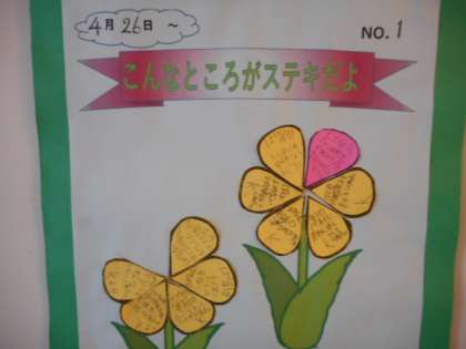 「こんなところがステキだよ」という掲示物には、友達からの温かいメッセージが花びら型の用紙に書かれており、ステキな花が咲いていました。