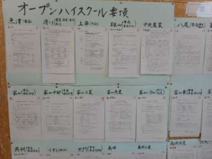 3年生の教室には、夏休みの期間に行われる高等学校のオープンハイスクールの案内が、学校ごとに貼られています。
