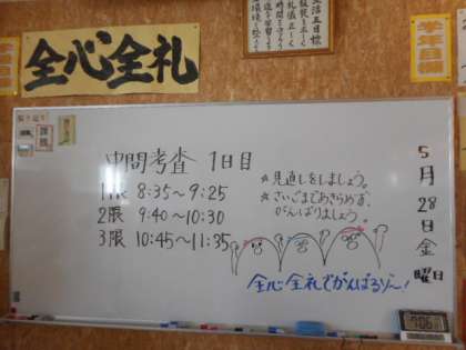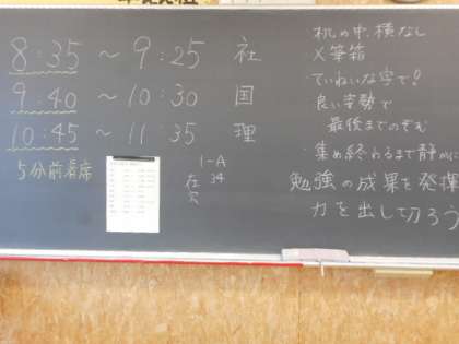 1年生にとっては、中学校に入学して初めての定期考査になります。また、2、3年生にとっても新しい学年になって最初の定期考査です。教室には、考査の日程に加えて担任からメッセージが書かれていました。