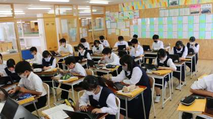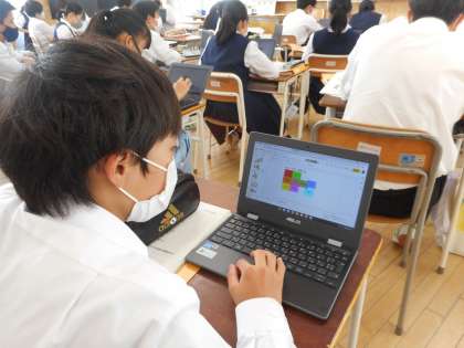 「14歳の未来展望」というテーマで、自分の進む道や職業について考えました。Chromebookを活用して、考えた内容を共有したり、VTRを視聴して働く意義について考えたりしました。