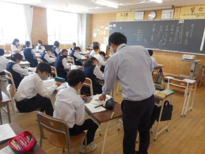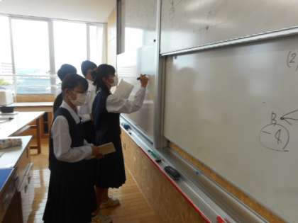 数学では、少人数での授業を行っています。計算問題をホワイトボードに書き、クラス全体で答えを確認しました。
