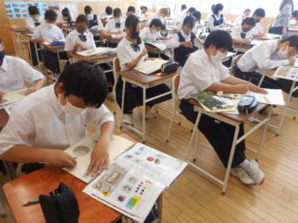 美術では、デッサンに取り組みました。立体や球を陰影をつけて描きました。