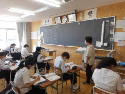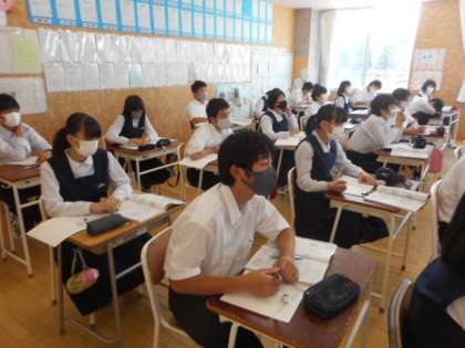 本日の授業(3年生) 公開日 2021/06/07 更新日 2021/06/07 芝園の一日 6月7日(月) 3年生の授業の様子です。 英語では、ペアになって学習した基本文を使った英会話を行いました。 数学では、平方根の計算問題に取り組みました。 理科では、化学の分野の学習をしました。どの授業でも、真剣にに学習に取り組む姿が見られました。