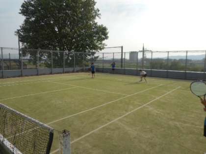 男子ソフトテニス部は、試合形式の練習をしました。鋭いサーブがコートに決まっていました。