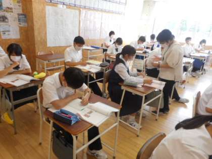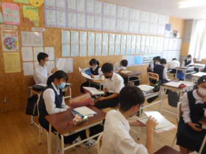 本日の授業(3年生) 公開日 2021/06/21 更新日 2021/06/21 芝園の一日 6月21日(月) 3年生の授業の様子です。 英語では、現在完了形の基本文を用いて、ペアになって会話の練習をしました。 数学では、平方根の応用問題に取り組みました。 美術では、空間を用いたデザインについて学習しました。