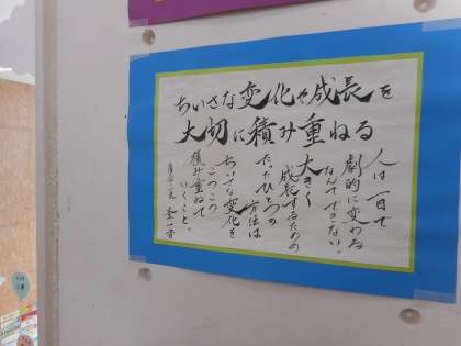 学年フロアには、国語科の学習の成果(「クマゼミ増加の原因を探る」での学びを活かした生徒自作の小説)を紹介して置いていたり、心に触れる言葉などを掲示したりしています。