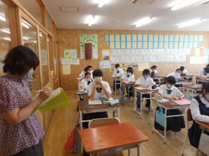 英語では、基本文の確認テストが返却されました。間違ったところを直し、学力の定着を図りました。