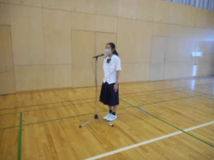 富山県中学校総合選手権と吹奏楽コンクールの壮行会を行いました。大会やコンクールに参加する生徒が豊富を述べました。