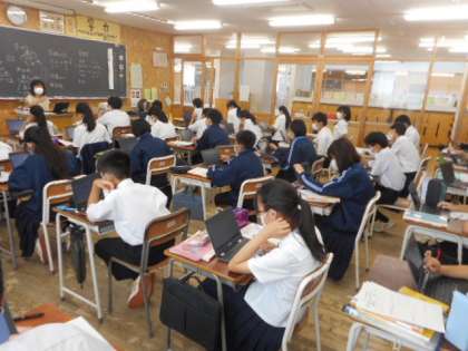 家庭科では、1人1台端末(タブレット)を使った授業を行いました。学習した内容の確認や、授業に対する感想の記入などもタブレットを活用しています。