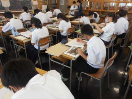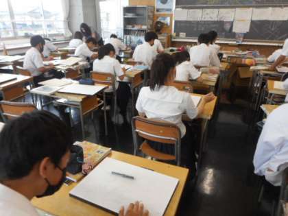 本日の授業(2年生:その1) 公開日 2021/07/15 更新日 2021/07/15 芝園の一日 7月15日(木) 2年生の授業の様子です。 美術では、身の回りのものをデザイン画に取り入れて作品を制作していました。
