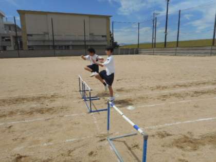 体育では、ハードル走に取り組みました。自分で課題を作り、練習方法を工夫して取り組んでいました。